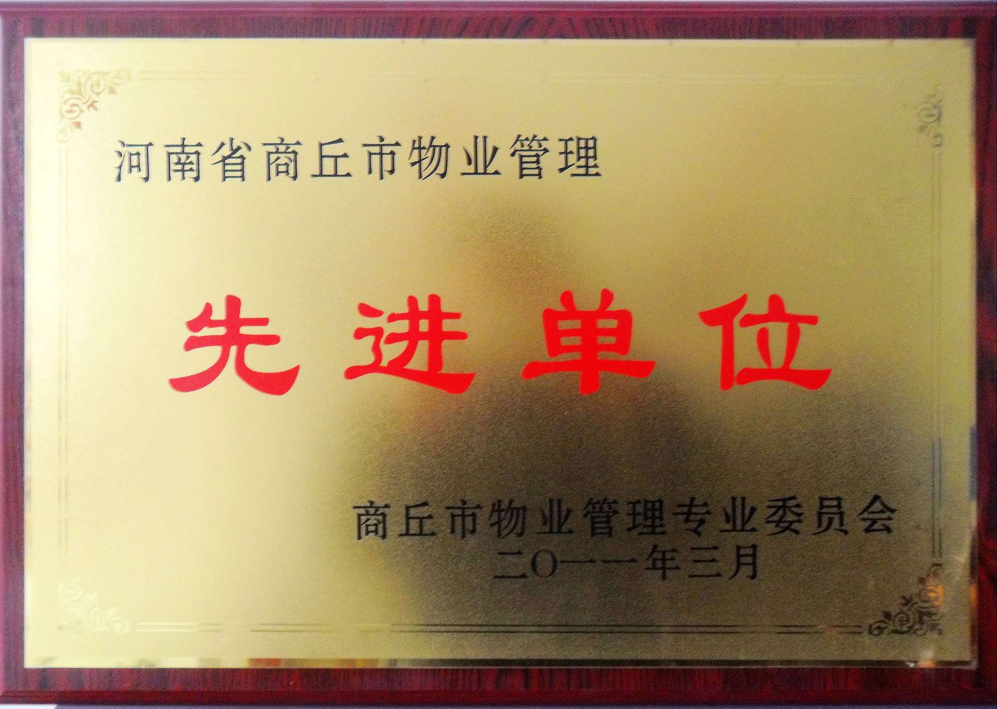 2011年3月30日,深圳泰源物業(yè)商丘分公司被商丘市房地產(chǎn)業(yè)協(xié)會、物業(yè)管理專業(yè)委員會評為“2010年度先進(jìn)物業(yè)管理企業(yè)”,并頒發(fā)了物業(yè)管理先進(jìn)單位獎牌。這項(xiàng)榮譽(yù)既是對我們的鼓勵,也是對我們今后工作的鞭策,總公司要求商丘分公司在今后的工作中進(jìn)一步增強(qiáng)責(zé)任意識、服務(wù)意識和誠信意識,發(fā)揮模范帶頭作用,為深圳物業(yè)管理企業(yè)在內(nèi)地發(fā)展增光添彩!