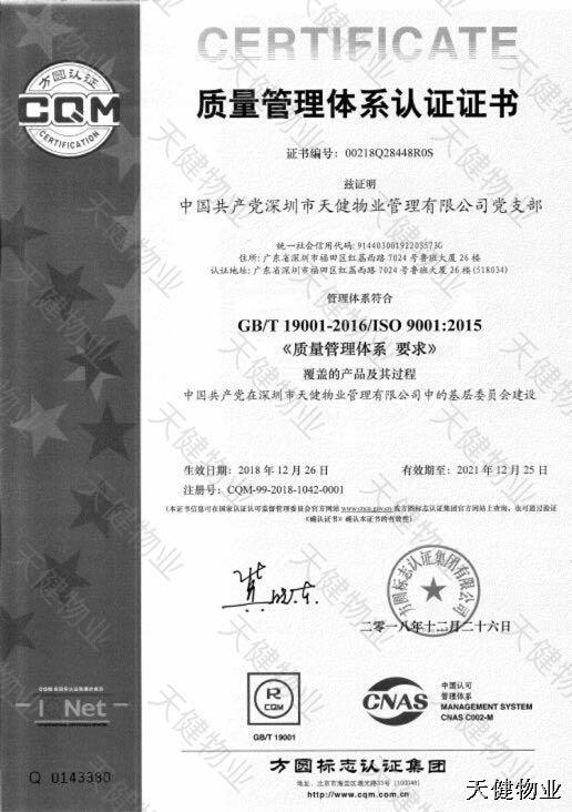 黨支部質(zhì)量管理體系認(rèn)證證書