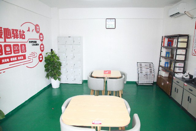 走進(jìn)驛站,暖流撲面而來。小屋里配置了休息座椅、空調(diào)、微波爐、藥箱、充電設(shè)備、雨傘、飲用水、圖書角等,環(huán)衛(wèi)工人、快遞小哥、外賣送餐員等在閑暇時可在此歇息、免費取用相關(guān)物件。