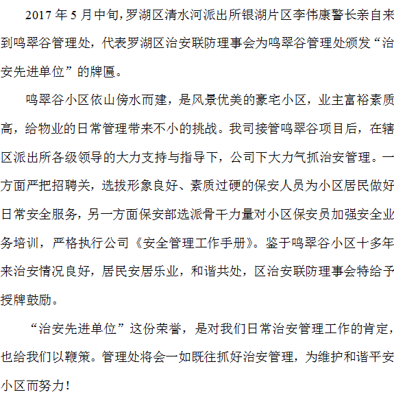 鳴翠谷管理處喜獲“治安先進(jìn)單位”稱號(hào)