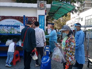 “請(qǐng)大家戴好口罩,提前打開健康碼,有序排隊(duì)取物。”在半島花園小區(qū)的快遞點(diǎn),管理處工作人員協(xié)助業(yè)戶提取生活物資。