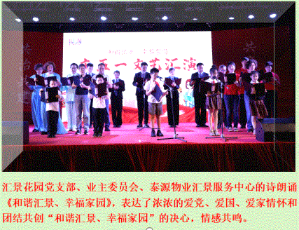 4月22日晚,南山區(qū)科技園社區(qū)匯景花園黨支部、業(yè)主委員會(huì)和泰源物業(yè)在匯景花園小區(qū)聯(lián)合舉辦了“和諧匯景,幸福家園”迎五一文藝匯演活動(dòng)。