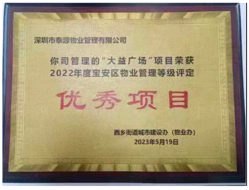 5月19日,在寶安區(qū)西鄉(xiāng)街道辦事處禮堂,舉行了2022年度寶安區(qū)住房和建設(shè)局物業(yè)管理等級(jí)評(píng)定頒獎(jiǎng)大會(huì)。由泰源物業(yè)提供物業(yè)服務(wù)的大益廣場(chǎng),榮獲2022年度寶安區(qū)住房和建設(shè)局物業(yè)管理等級(jí)評(píng)定優(yōu)秀項(xiàng)目獎(jiǎng)。
