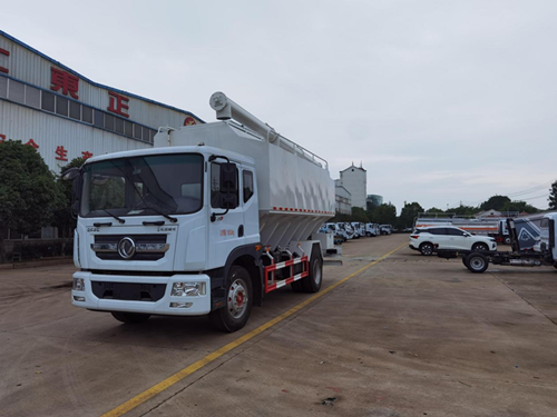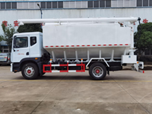 散裝飼料運(yùn)輸車,散裝飼料車的飼料罐架設(shè)在卡車的底盤上,罐頂開有進(jìn)料口.頂部的一根螺旋輸送卸料管(俗稱卸料絞龍)則可自由回轉(zhuǎn)和抬升,抬升的仰角可達(dá)60度。運(yùn)輸時,頂部的螺旋管平臥在罐頂;卸料時則抬起,使管端的出料口與畜禽飼養(yǎng)場貯料罐頂部的進(jìn)料門相接,駕駛室內(nèi)裝有操縱裝置(操縱裝置也可裝置在罐體尾部),卸料時通過車底的動力輸出軸和減速器來驅(qū)動螺旋,以完成卸料。