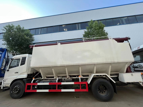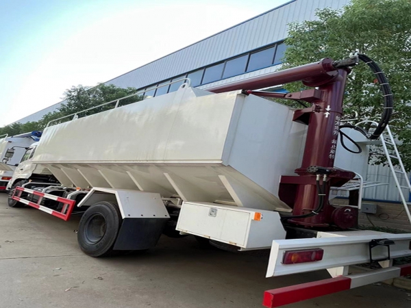 散裝飼料運輸車,散裝飼料車的飼料罐架設在卡車的底盤上,罐頂開有進料口.頂部的一根螺旋輸送卸料管(俗稱卸料絞龍)則可自由回轉和抬升,抬升的仰角可達60度。運輸時,頂部的螺旋管平臥在罐頂;卸料時則抬起,使管端的出料口與畜禽飼養(yǎng)場貯料罐頂部的進料門相接,駕駛室內(nèi)裝有操縱裝置(操縱裝置也可裝置在罐體尾部),卸料時通過車底的動力輸出軸和減速器來驅動螺旋,以完成卸料。
