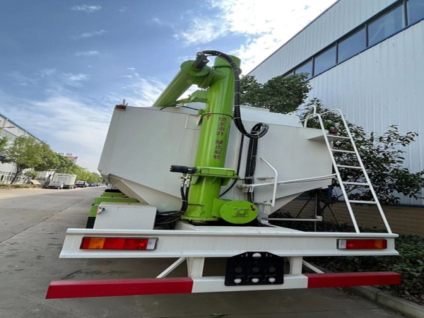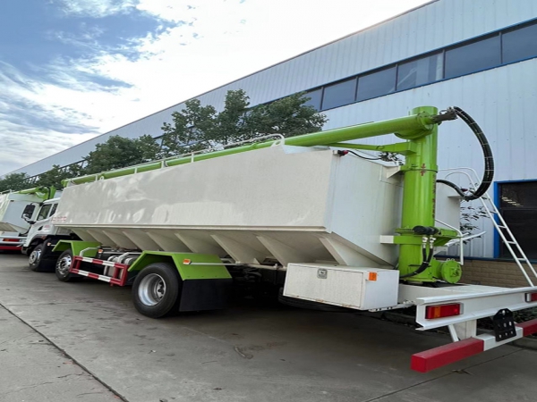 散裝飼料運(yùn)輸車,散裝飼料車的飼料罐架設(shè)在卡車的底盤上,罐頂開(kāi)有進(jìn)料口.頂部的一根螺旋輸送卸料管(俗稱卸料絞龍)則可自由回轉(zhuǎn)和抬升,抬升的仰角可達(dá)60度。運(yùn)輸時(shí),頂部的螺旋管平臥在罐頂;卸料時(shí)則抬起,使管端的出料口與畜禽飼養(yǎng)場(chǎng)貯料罐頂部的進(jìn)料門相接,駕駛室內(nèi)裝有操縱裝置(操縱裝置也可裝置在罐體尾部),卸料時(shí)通過(guò)車底的動(dòng)力輸出軸和減速器來(lái)驅(qū)動(dòng)螺旋,以完成卸料。