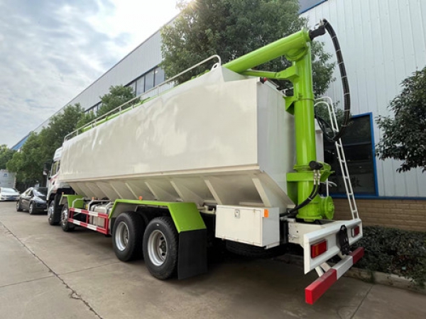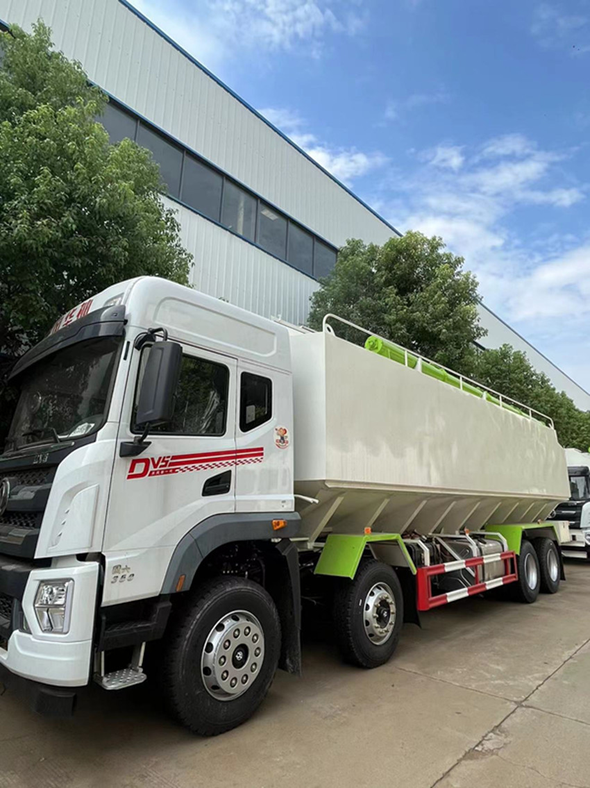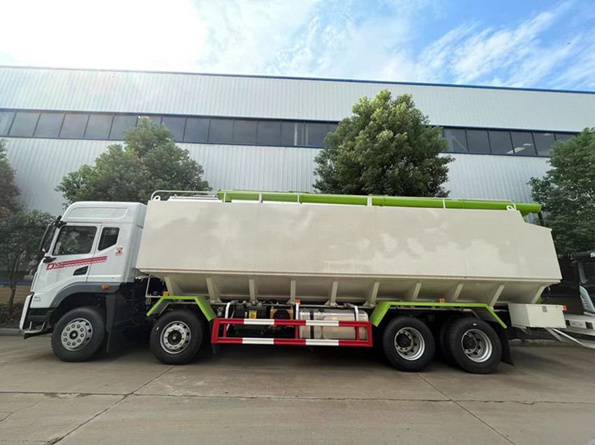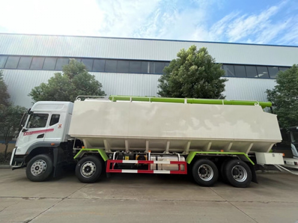 散裝飼料運(yùn)輸車,散裝飼料車的飼料罐架設(shè)在卡車的底盤上,罐頂開(kāi)有進(jìn)料口.頂部的一根螺旋輸送卸料管(俗稱卸料絞龍)則可自由回轉(zhuǎn)和抬升,抬升的仰角可達(dá)60度。運(yùn)輸時(shí),頂部的螺旋管平臥在罐頂;卸料時(shí)則抬起,使管端的出料口與畜禽飼養(yǎng)場(chǎng)貯料罐頂部的進(jìn)料門相接,駕駛室內(nèi)裝有操縱裝置(操縱裝置也可裝置在罐體尾部),卸料時(shí)通過(guò)車底的動(dòng)力輸出軸和減速器來(lái)驅(qū)動(dòng)螺旋,以完成卸料。