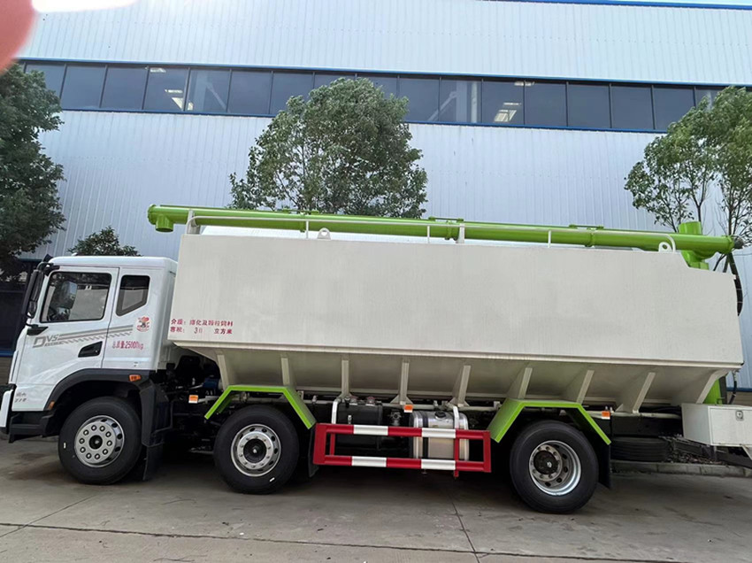 散裝飼料運(yùn)輸車,散裝飼料車的飼料罐架設(shè)在卡車的底盤上,罐頂開有進(jìn)料口.頂部的一根螺旋輸送卸料管(俗稱卸料絞龍)則可自由回轉(zhuǎn)和抬升,抬升的仰角可達(dá)60度。運(yùn)輸時(shí),頂部的螺旋管平臥在罐頂;卸料時(shí)則抬起,使管端的出料口與畜禽飼養(yǎng)場貯料罐頂部的進(jìn)料門相接,駕駛室內(nèi)裝有操縱裝置(操縱裝置也可裝置在罐體尾部),卸料時(shí)通過車底的動(dòng)力輸出軸和減速器來驅(qū)動(dòng)螺旋,以完成卸料。