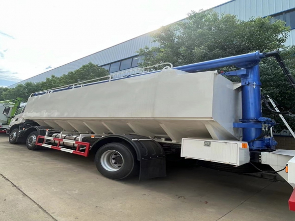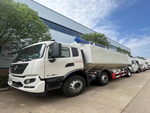 散裝飼料運輸車,散裝飼料車的飼料罐架設在卡車的底盤上,罐頂開有進料口.頂部的一根螺旋輸送卸料管(俗稱卸料絞龍)則可自由回轉和抬升,抬升的仰角可達60度。運輸時,頂部的螺旋管平臥在罐頂;卸料時則抬起,使管端的出料口與畜禽飼養(yǎng)場貯料罐頂部的進料門相接,駕駛室內裝有操縱裝置(操縱裝置也可裝置在罐體尾部),卸料時通過車底的動力輸出軸和減速器來驅動螺旋,以完成卸料。