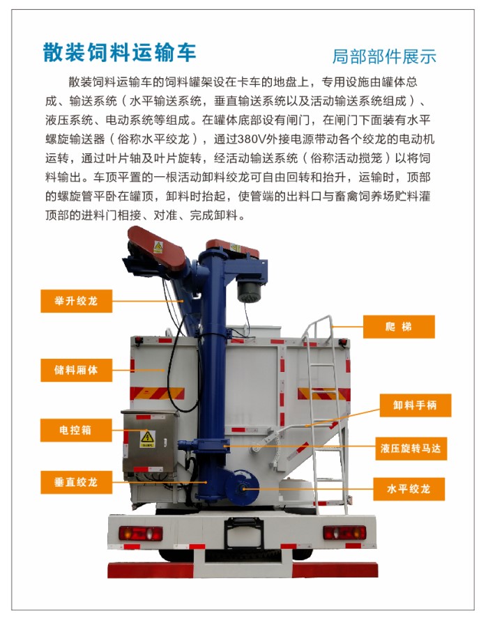 上裝配置:罐體采用4mm優(yōu)質(zhì)鈦鋼板制作,罐體分為肆個倉(可根據(jù)用戶需求做多個分倉),可以各分倉卸料順序和速度,整車3條絞龍(底部水平絞龍、尾部垂直絞龍、頂部舉升絞龍),由3個5.5kw 380v電機帶動各絞龍工作,頂部絞龍液壓舉升,可左右旋轉(zhuǎn)180° 此車公告+環(huán)保+燃油齊全,全國上戶無憂!